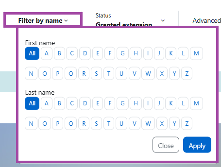 - ‘Status’ – With this filter, you could filter submissions to their given submission status (e.g. ‘Not submitted’, ‘Draft’, ‘Submitted’, etc). Please ensure it is set to ‘All’.