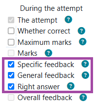 • ‘Right answer’ – this setting controls whether automatic feedback about the correct answers should be generated for your students after each question. This setting can be replaced with the ‘General feedback’.